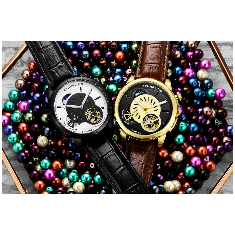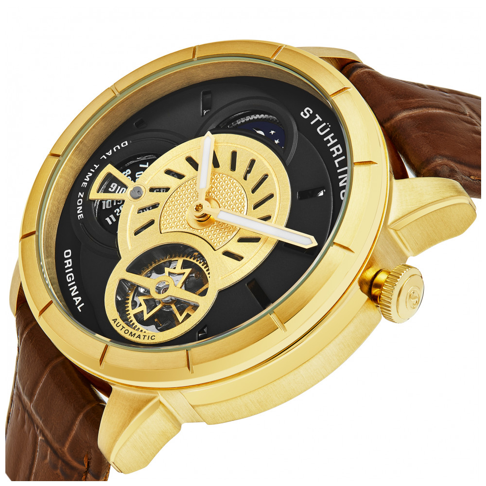 Relógio Masculino Stuhrling Tesla 686 Automático 45mm, Preto: Tamanho da Caixa 45mm Resistente à água 5 ATM 50 metros, 165 pés Bisel chanfrado de aço inoxidável Pulseira de couro com relevo de crocodilo