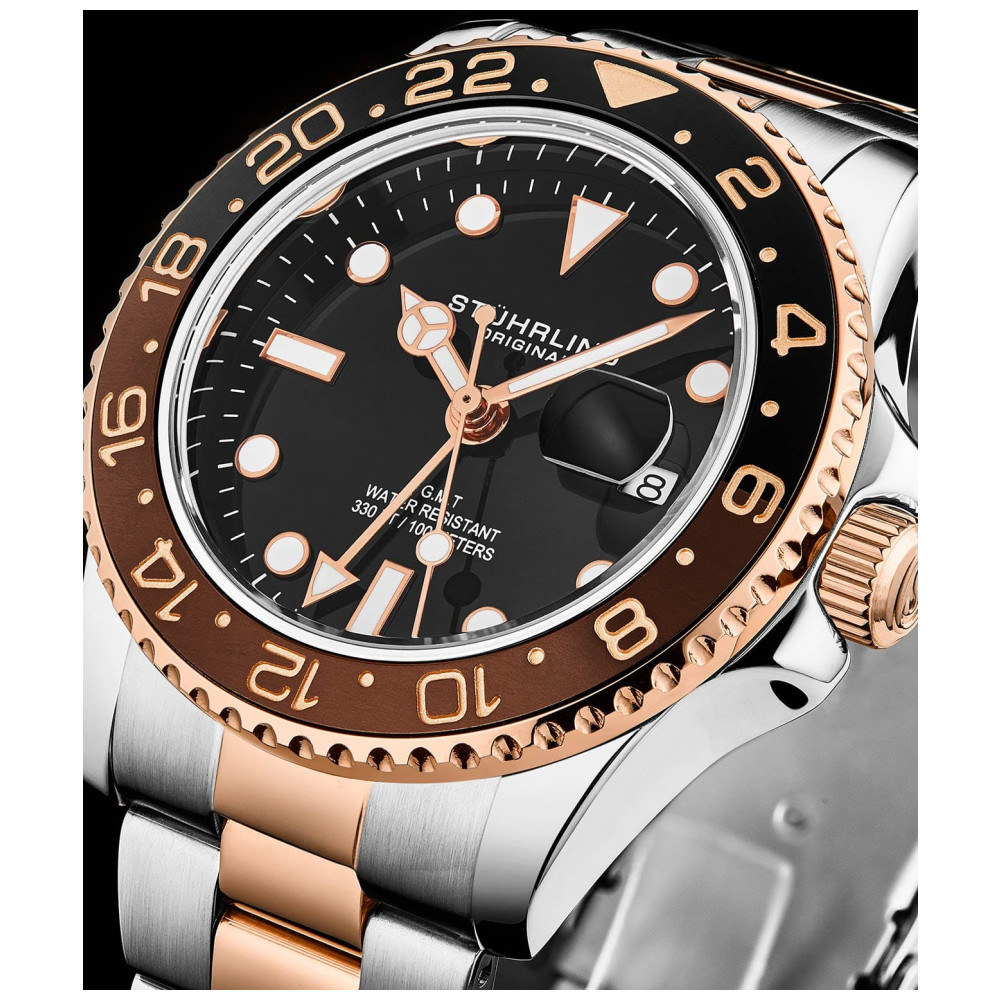 Relógio Meridian 3965 42mm, Mostrador Preto, Pulseira de aço Inoxidável Rosa, Stuhrling: O Relógio Stuhrling Meridian 3965 de 42mm é uma combinação perfeita de elegância e precisão.