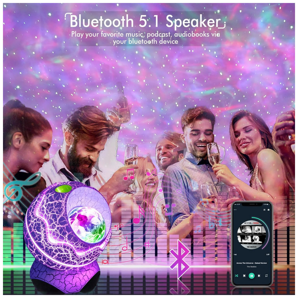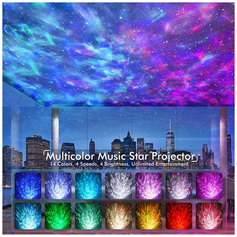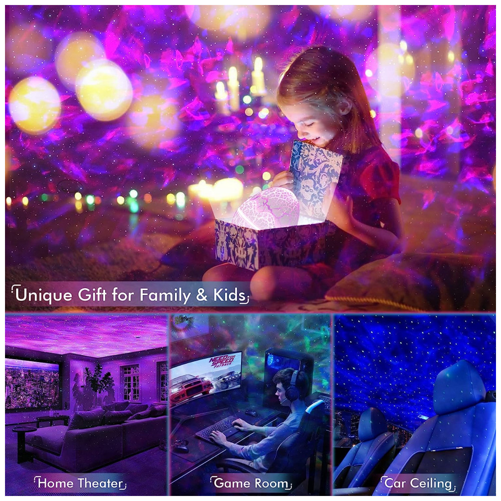 Apresenta 14 cores vibrantes que projetam estrelas brilhantes e memorizam nuvens nebulosas, o projetor starlight traz o vasto céu estrelado para dentro de casa, onde você e as crianças podem desfrutar da pacífica galáxia em seu quarto ou quarto de criança.