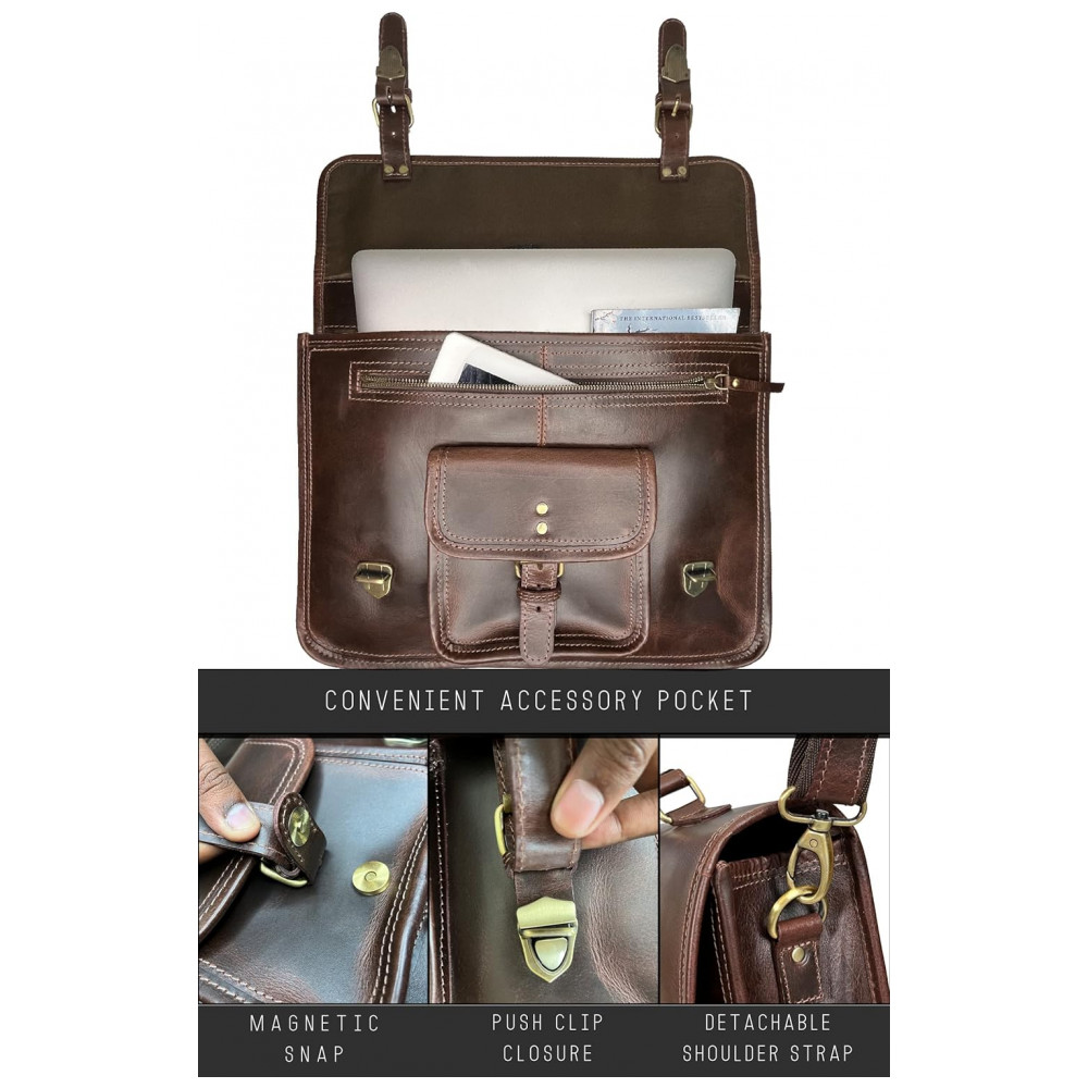 tem aquele visual de pasta de couro difícil de conseguir, embora seja urbano e moderno com fivelas e acessórios de latão, forro e costura resistentes e zíperes YKK AJUSTE PARA O CONFORTO para aquelas viagens longas, a alça de ombro nesta bolsa de couro para laptop é totalmente ajustável há também uma pulseira de segurança para manter as coisas seguras em qualquer lugar ACESSO RÁPIDO ÀS SUAS COISAS organize se facilmente com 1 1 compartimentos, 1 bolso interno de segurança com zíper, 1 bolso externo com zíper e 1 bolso externo de acesso rápido ideal para pequenos laptops e tablets