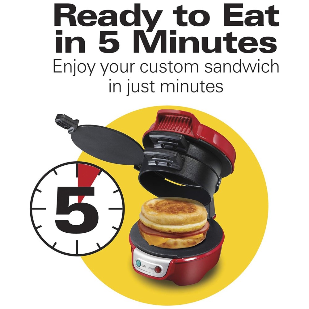 Com a sanduicheira de café da manhã Hamilton Beach, você pode desfrutar de um sanduíche de café da manhã quente de menos de 5 minutos.
