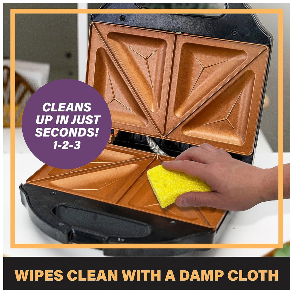 SANDUÍCHES PERFEITOS TODAS AS VEZES torrar o pão e selar com uma indentação diagonal para facilitar o corte ao meio COMPACTO E PORTÁTIL perfeito para dormitórios e cozinhas de todos os tamanhos