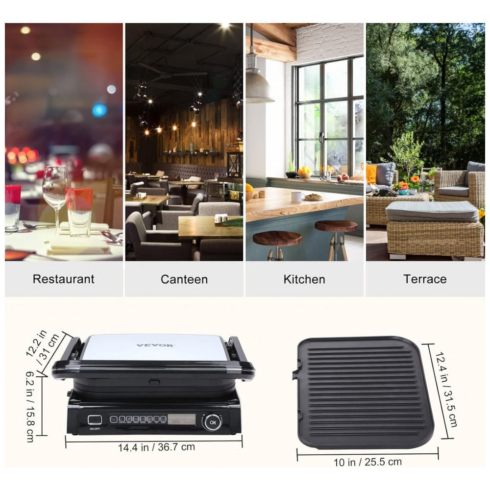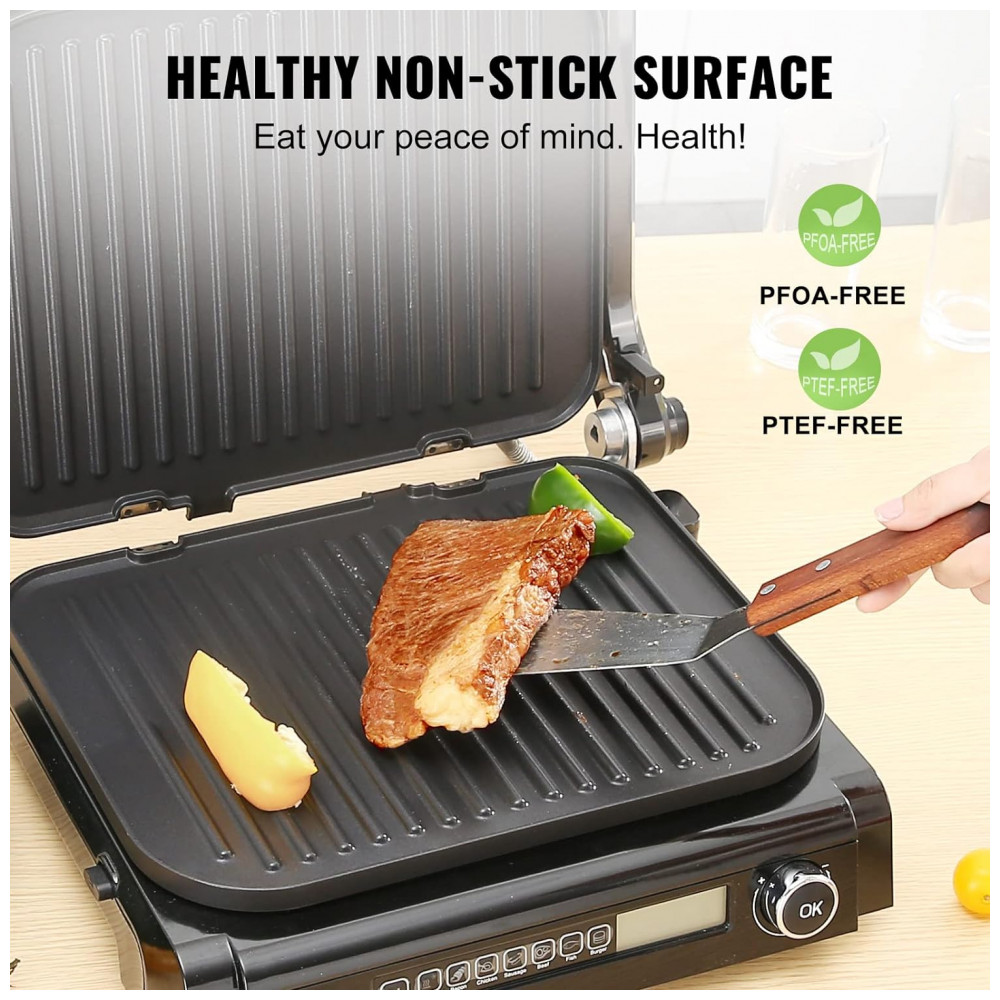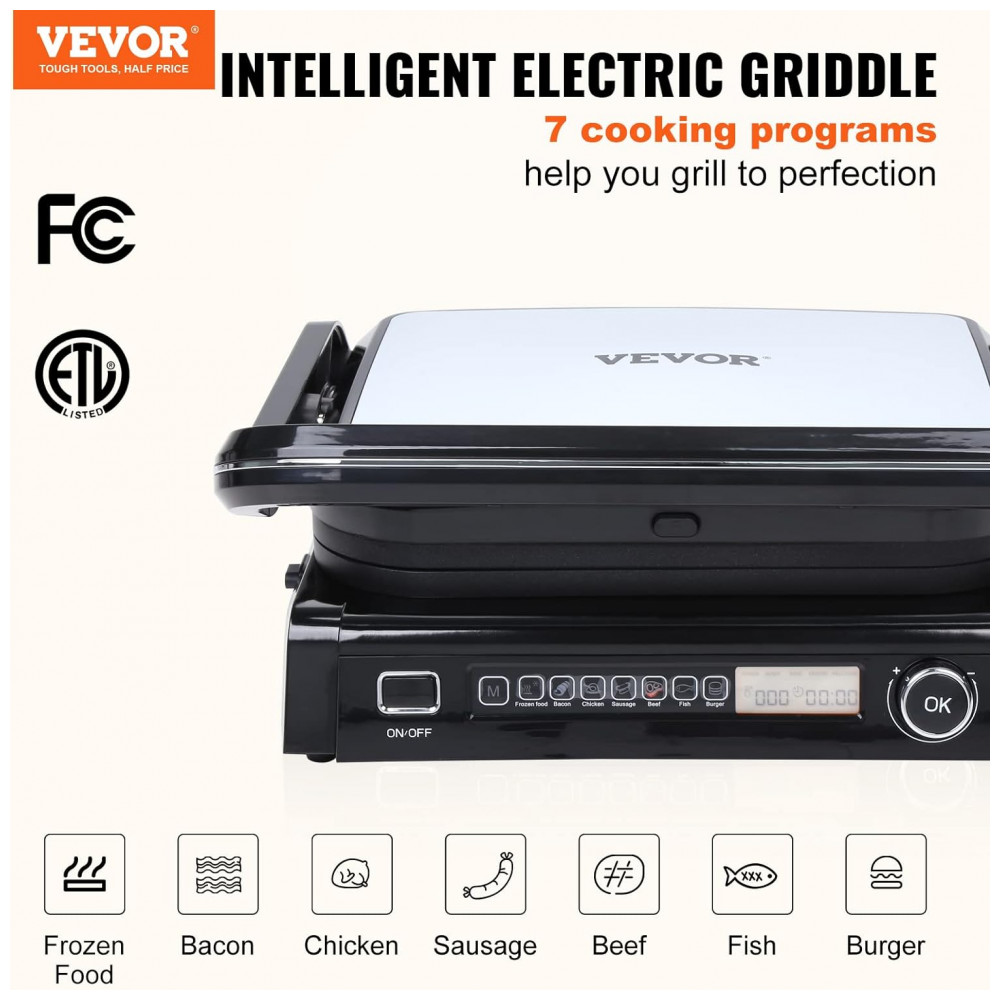 Sanduicheira e Grill Elétrico 7 em 1 de com Superfície Antiaderente e Removível, Controle de Temperatura e Display LCD, 1800W, 110v, VEVOR, Preta: Grelhe seus alimentos com perfeição com a nossa grelha elétrica de potência 1800W, ideal para uso em ambientes familiares ou comerciais.