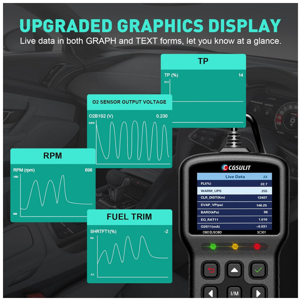 Scanner Automotivo com Diagnóstico OBDII e Tela LED, 12V, CGSULIT SC301, Preto: Scanner multifuncional Como uma ferramenta de verificação de diagnóstico do veículo, o scanner CGSULIT SC301 obd2 pode ler e registrar dados ao vivo rapidamente, visualizar dados de quadro congelado, ler , apagar DTCs códigos de falha do motor, desligar o CEL verificar a luz do motor, executar Teste de monitoramento de O2, teste de monitor on board, etc.