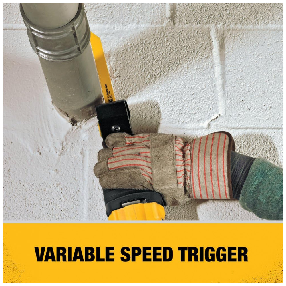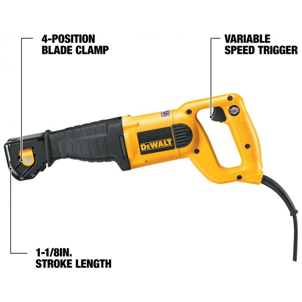Serra Sabre com Motor de e Braçadeira de 4 Posições, 110v, DEWALT DWE304, Amarelo: O potente motor de eres da serra alternativa foi projetado para aplicações pesadas O grampo da lâmina de 4 posições permite um corte nivelado e maior versatilidade 0 2.