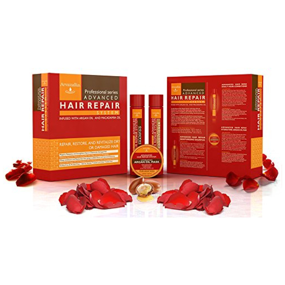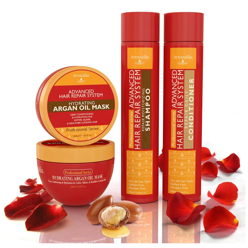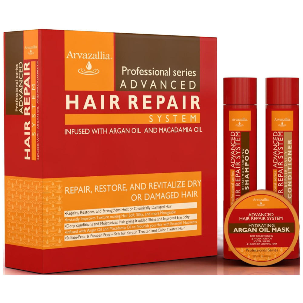 O Arvazallia Advanced Hair Repair System com óleo de Argan e óleo de macadâmia é um sistema premium de reparação e restauração de cabelos sem parabenos e sem sulfato, projetado para restaurar, fortalecer e revitalizar cabelos secos ou danificados ou enfraquecidos pelo aquecimento, processamento químico, ou coloração.