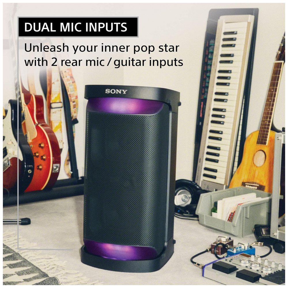 Poderoso som de festa com MEGA BASS Até 20 horas de bateria com carregamento rápido Alto falante X Balanced para graves potentes Design resistente a respingos IPX4 conceito de iluminação indireta por LED Liberte a sua estrela pop interior com 2 entradas traseiras de microfone , guitarra Alça de transporte integrada para fácil portabilidade