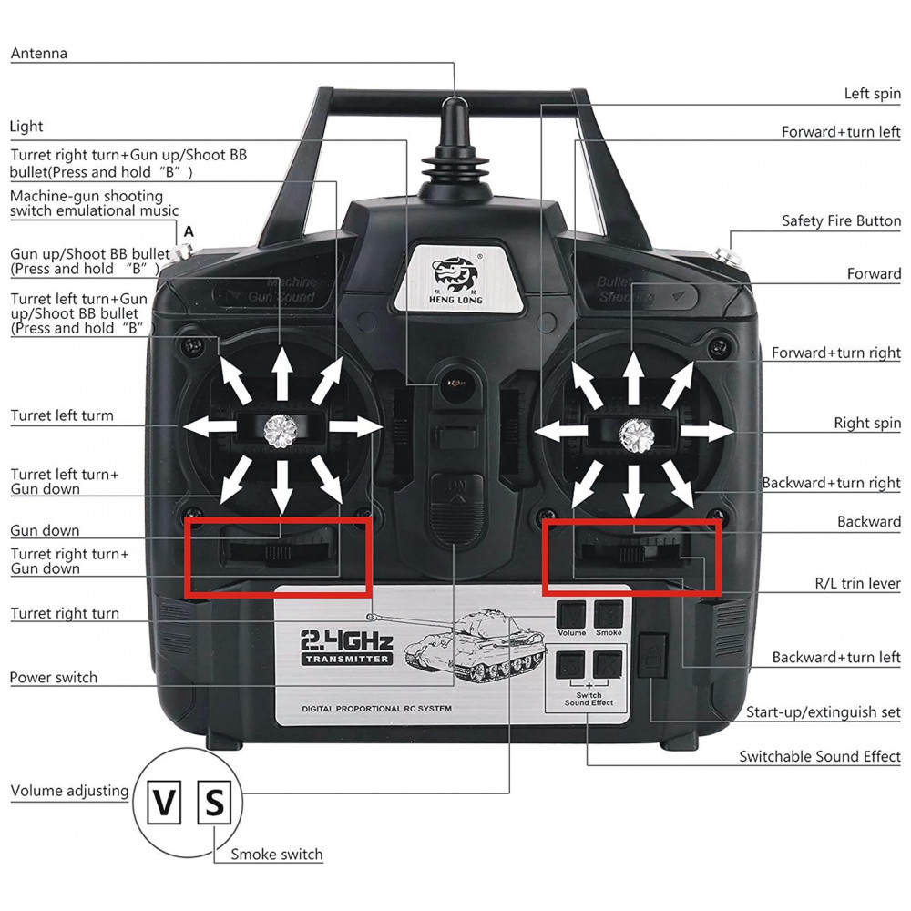O tanque também conta com um sistema eletrônico completo com controle remoto de fumaça e sistema de som, que inclui simulador de efeitos de fumaça, som de motor e metralhadora, além de ações mecânicas imitando um tanque real.