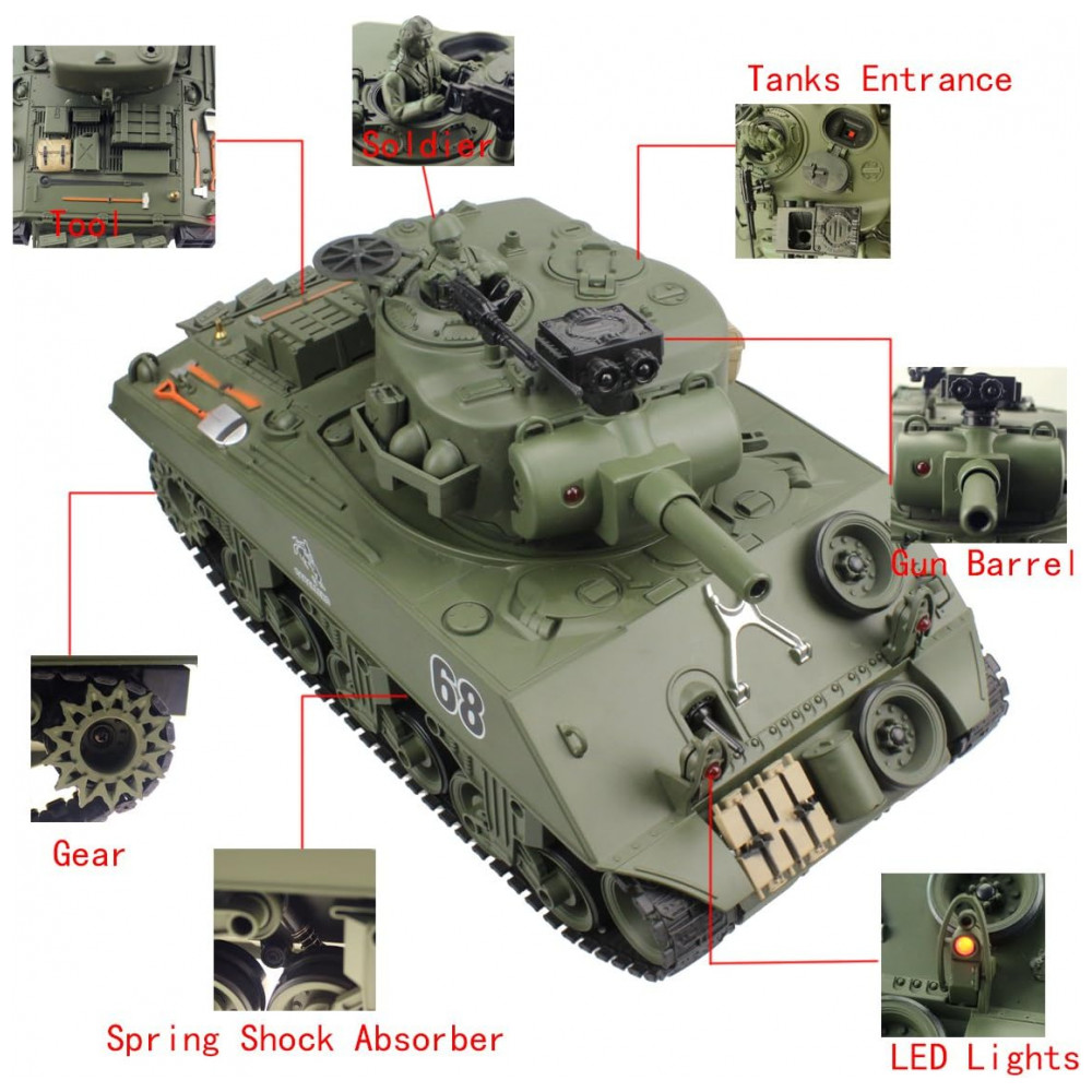 Tanque Sherman M4A3 para Adultos com Controle Remoto 2.4Ghz, 15 Funções e Disparo de Airsoft, Verde: Prezado Cliente, Apresentamos essa incrível réplica realista de tanque militar, destinada a colecionadores adultos apaixonados por história militar para fins recreativos.
