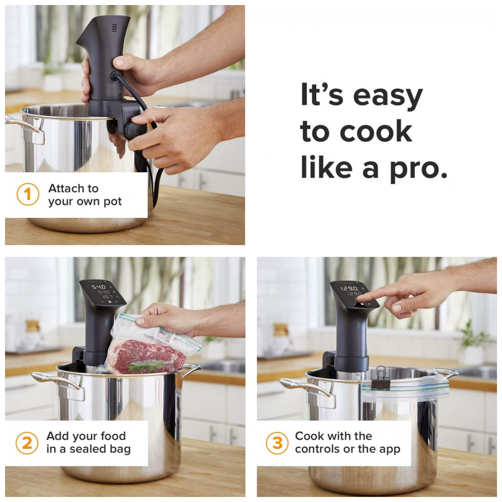 Construído com aço inoxidável, o Anova Pro é testado contra quedas e classificado como IPX 7 deixe o dispositivo cair no chão ou mergulhe o na água e você pode continuar cozinhando Sem problemas Fácil de usar basta conectar o fogão de precisão à sua própria panela ou recipiente, encher a panela ou recipiente com água, adicionar seus alimentos em um saco selado e cozinhar manualmente com os controles integrados ou com o aplicativo Anova