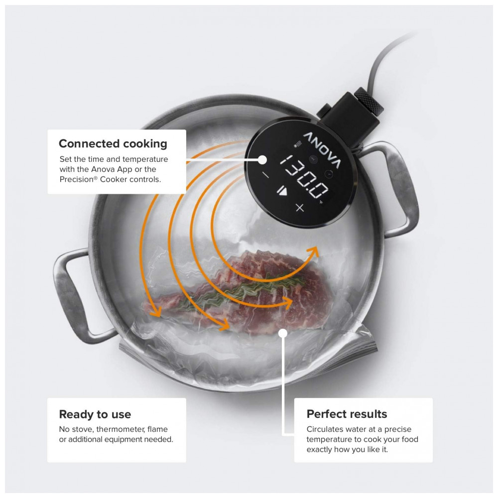 O Anova Precision Cooker circula água na temperatura exata necessária para refeições perfeitamente cozidas, não importa o que está no seu menu.