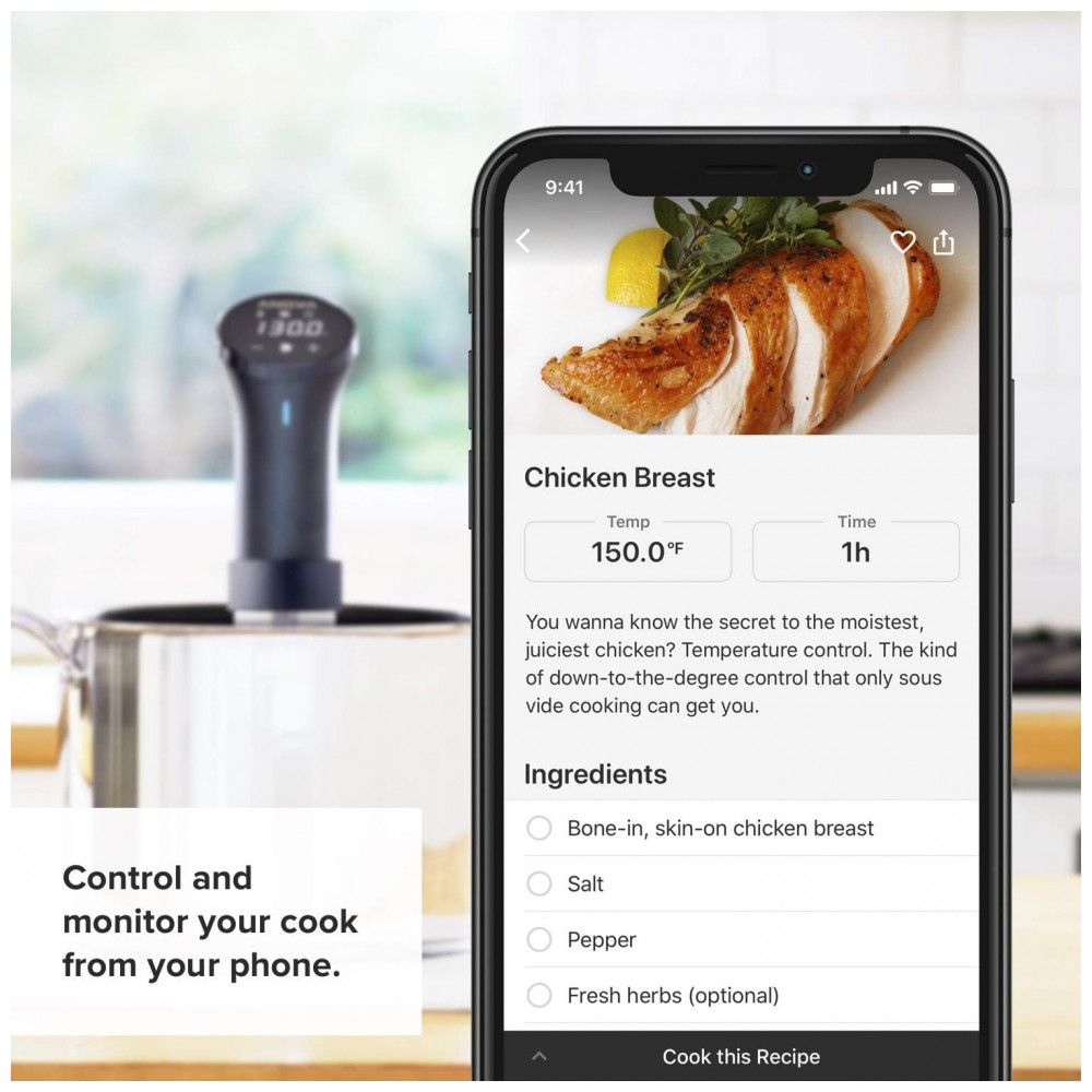 Use o aplicativo Anova para acessar milhares de receitas gratuitas e monitorar seu cozinheiro de qualquer lugar através do seu smartphone.