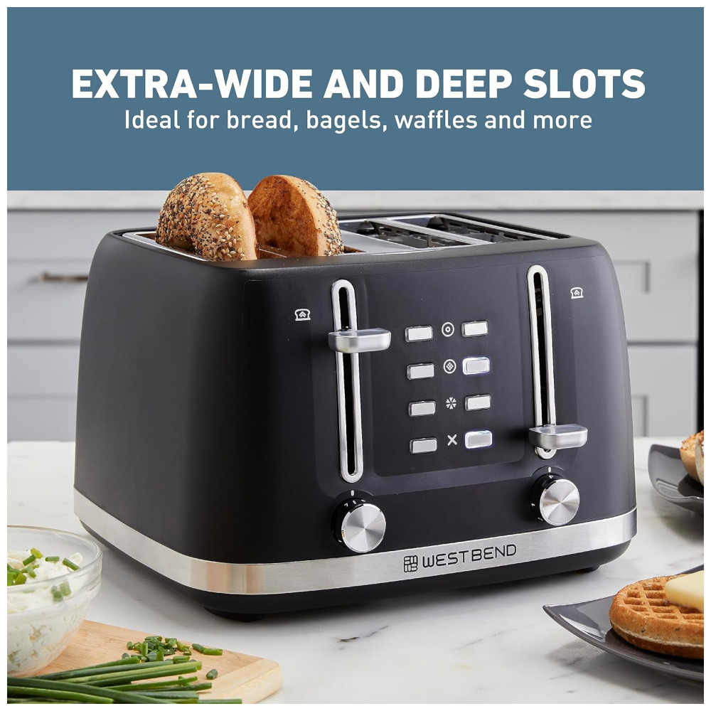 Torradeira 4 Fatias com 7 Níveis de Tostagem, Alavanca de Elevação Manual e Desligamento Automático, 1500W, West Bend, Preta: Este produto possui 4 slots extralargos e profundos com guias autocentrantes, ideais para torrar pães, bagels, waffles e outros alimentos.