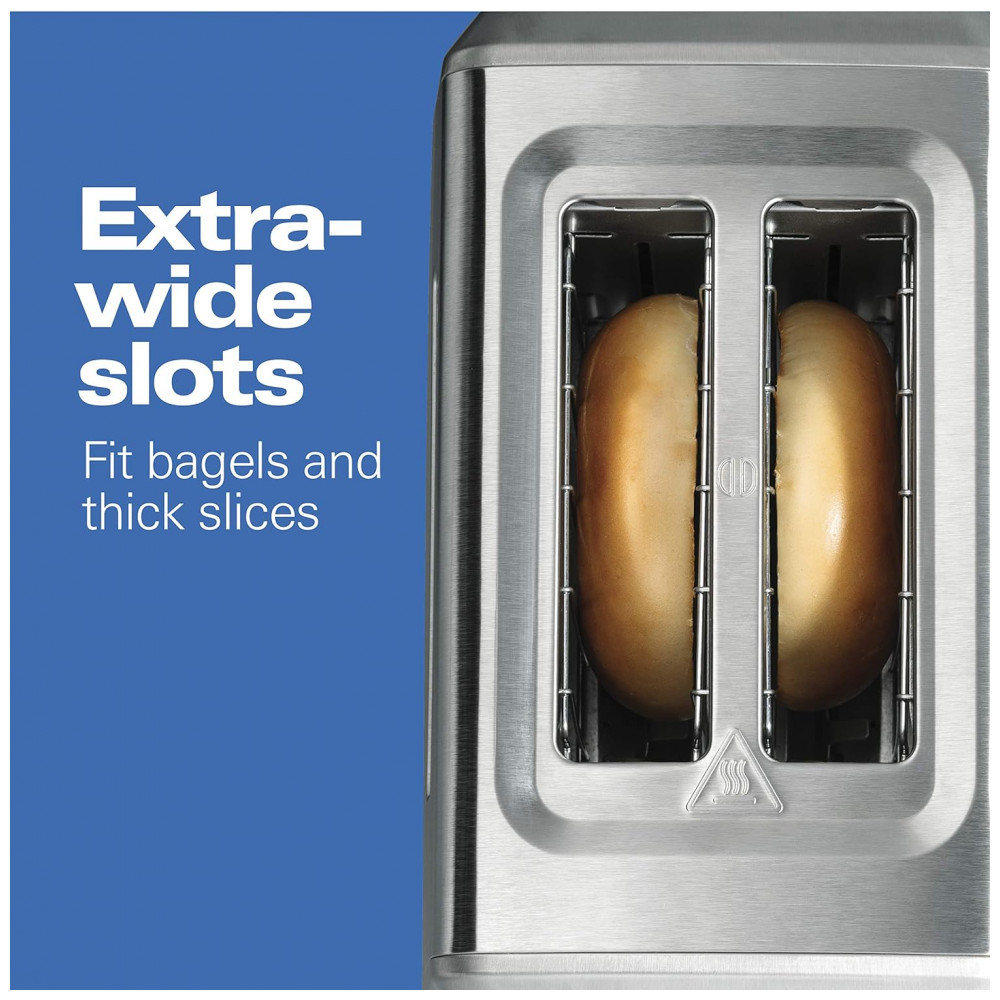 Com a torradeira Hamilton Beach, torrar fatias de pão é apenas a metade. Duas ranhuras extra largas e uma configuração especial para bagel permitem torrar o lado cortado de um bage…