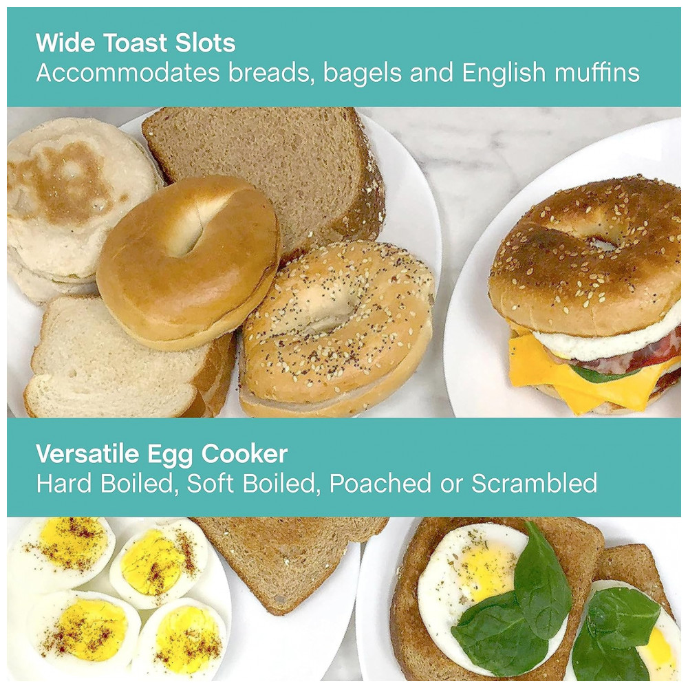 FOGÃO DE OVOS Ferva até 8 ovos moles ou duros de uma vez ou escalde facilmente ou mexa dois ovos em cerca de 4 minutos TORRADEIRA as ranhuras largas para torrar tornam mais fácil t…