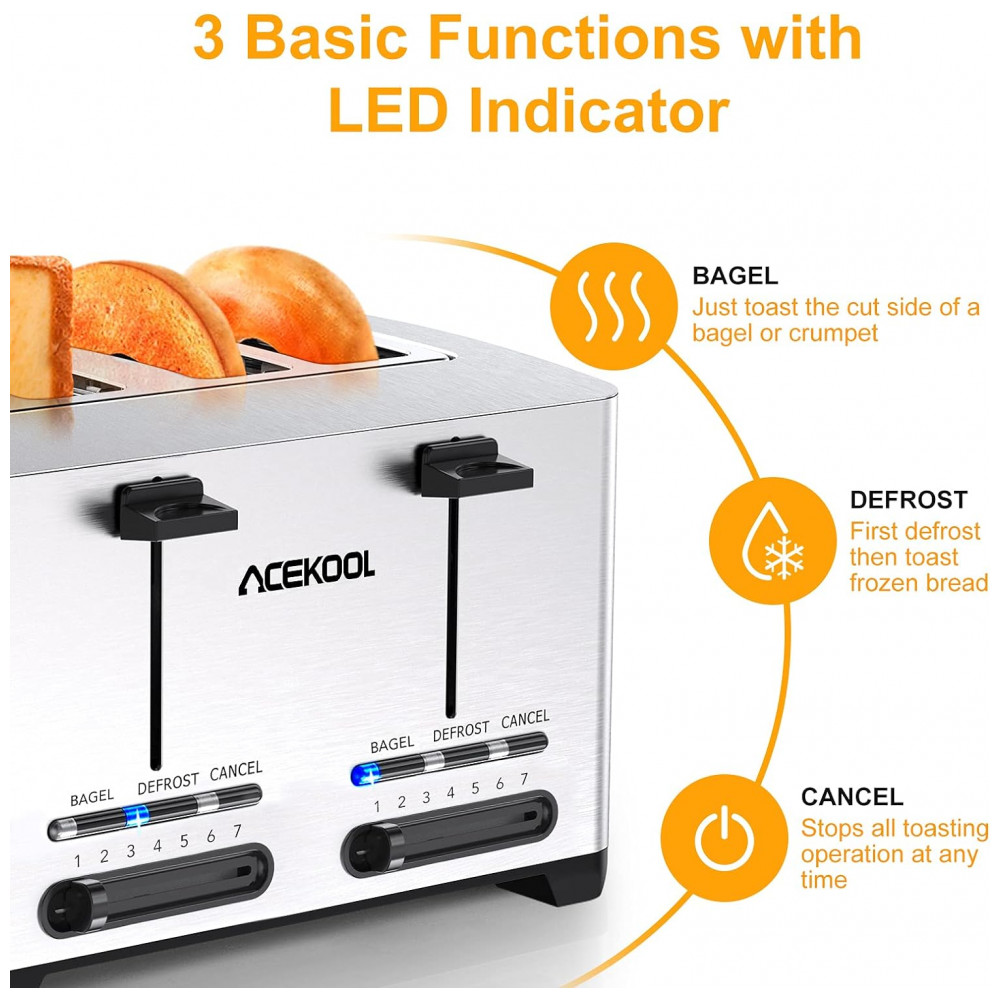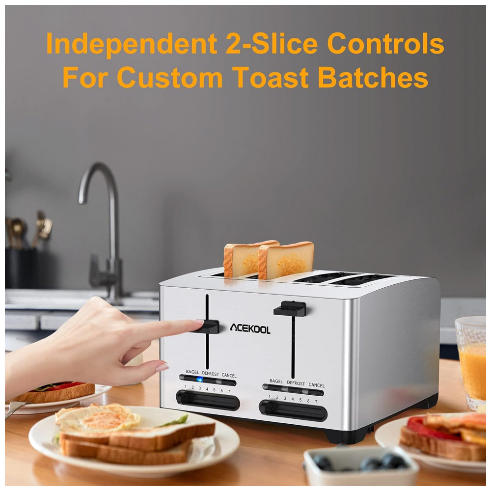 Torradeira de 4 Fatias com 7 Níveis e Função Bagel, 1500W, Aço Inoxidável, 110v, ACEKOOL, Prateado