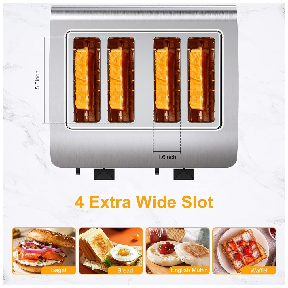 4 slots e 2 painéis de controle independentes Slots extra largos de torradeira de aço inoxidável são adequados para torradas, torradas Texas, muffin, waffle, bagel e assados em dif…