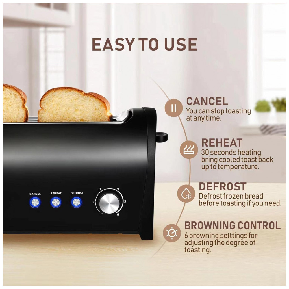 Esta torradeira tem um slot extra largo de , pode satisfazê lo torrar todos os tipos de pão, como torradas, bagel, muffin inglês, waffle, doces e etc.