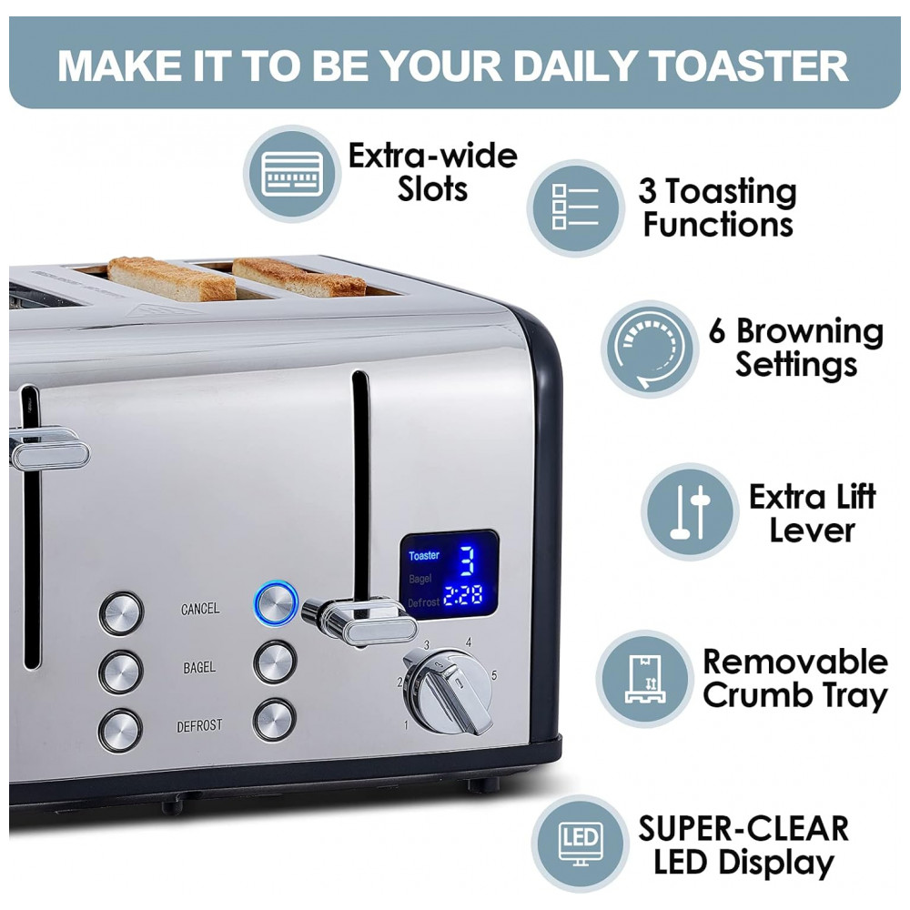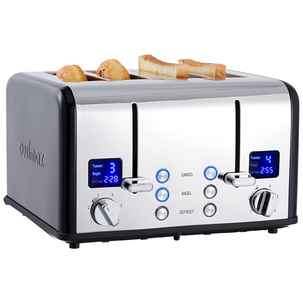 Torradeira Elétrica 4 Fatias com 6 Níveis Tostagem de Aço Inoxidável com Tela LCD, 110v, CUSIMAX, Prateado