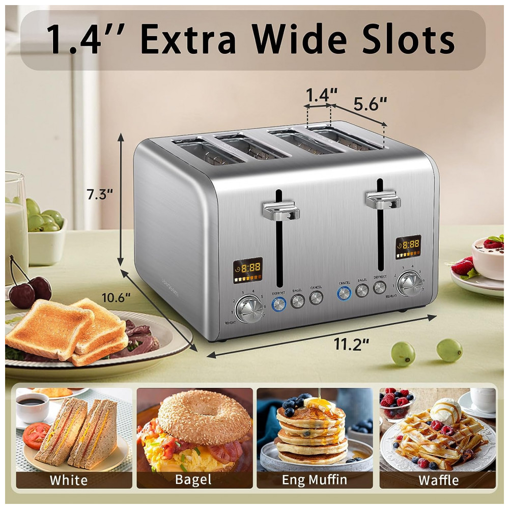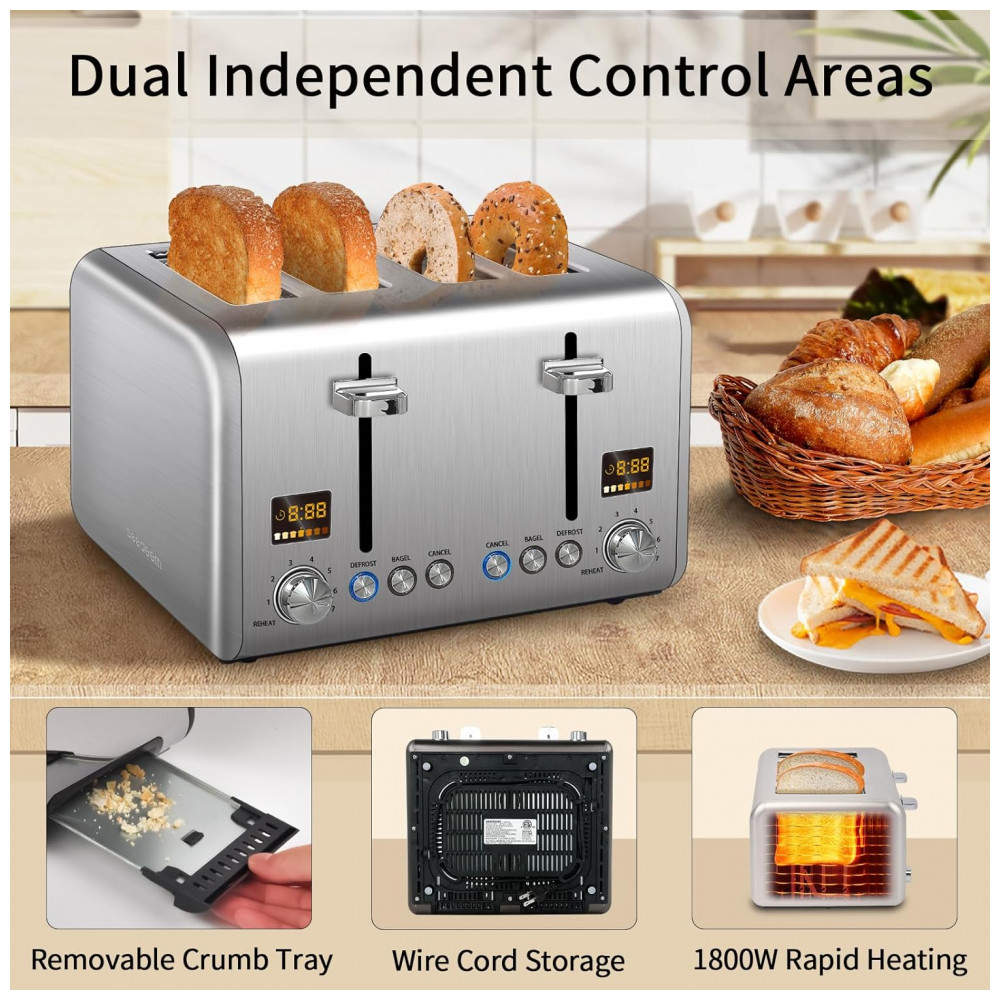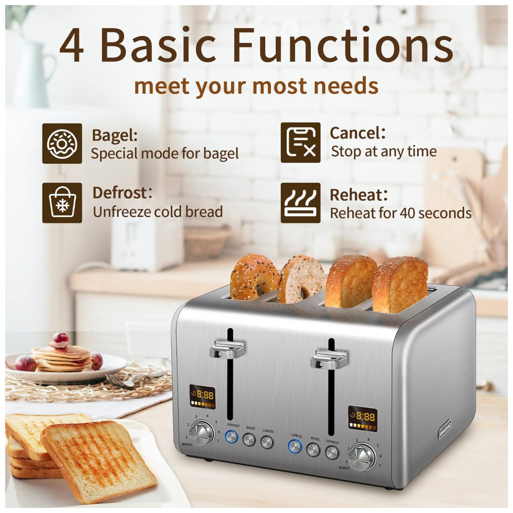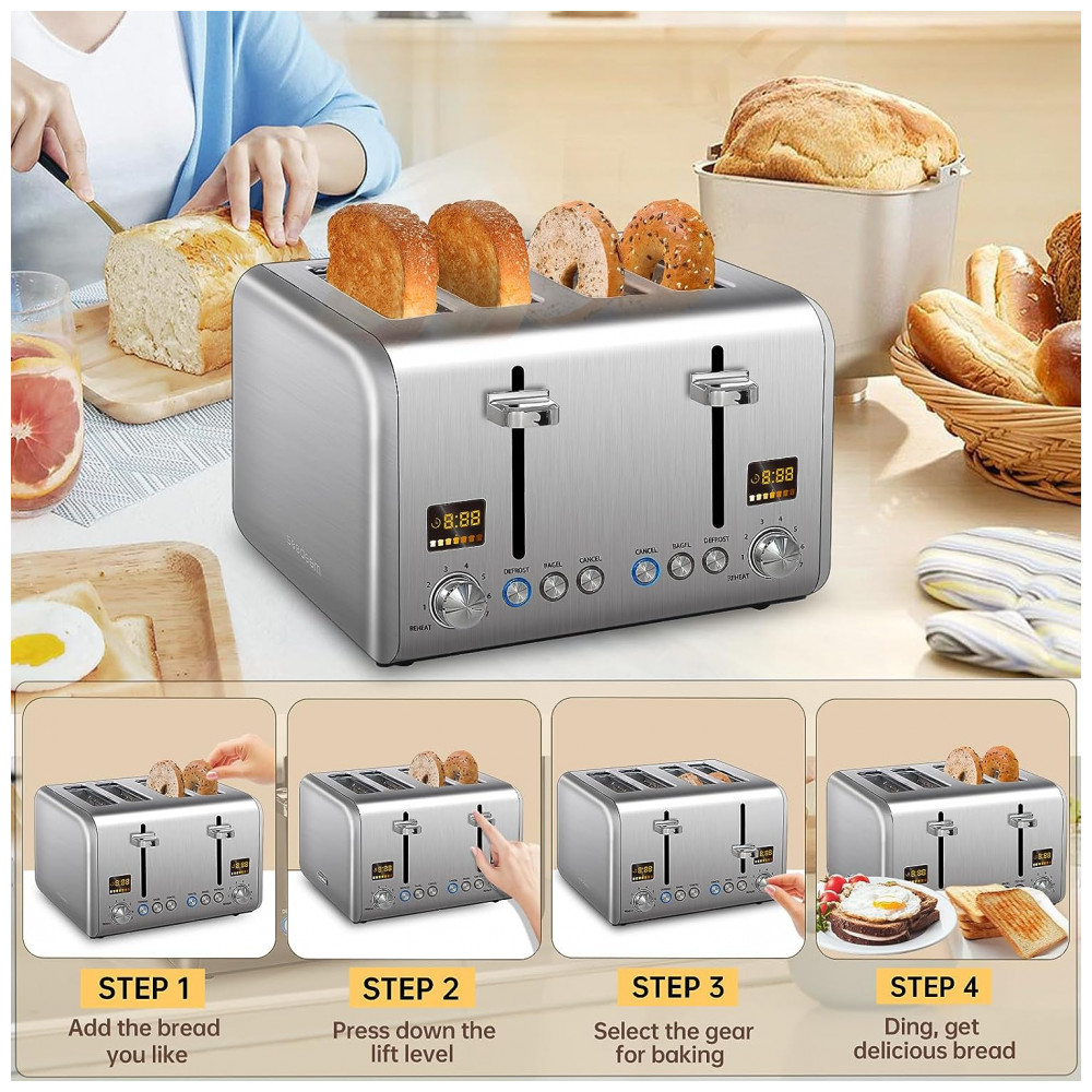 Torradeira Elétrica 4 Fatias com 7 Níveis de Tostagem, 1800W, 110v, SEEDEEM, Prateado: Controle Inteligente Esta torradeira de 1800W possui 2 visores LCD coloridos, para que você possa ver claramente o nível de configuração da sombra e o tempo restante.