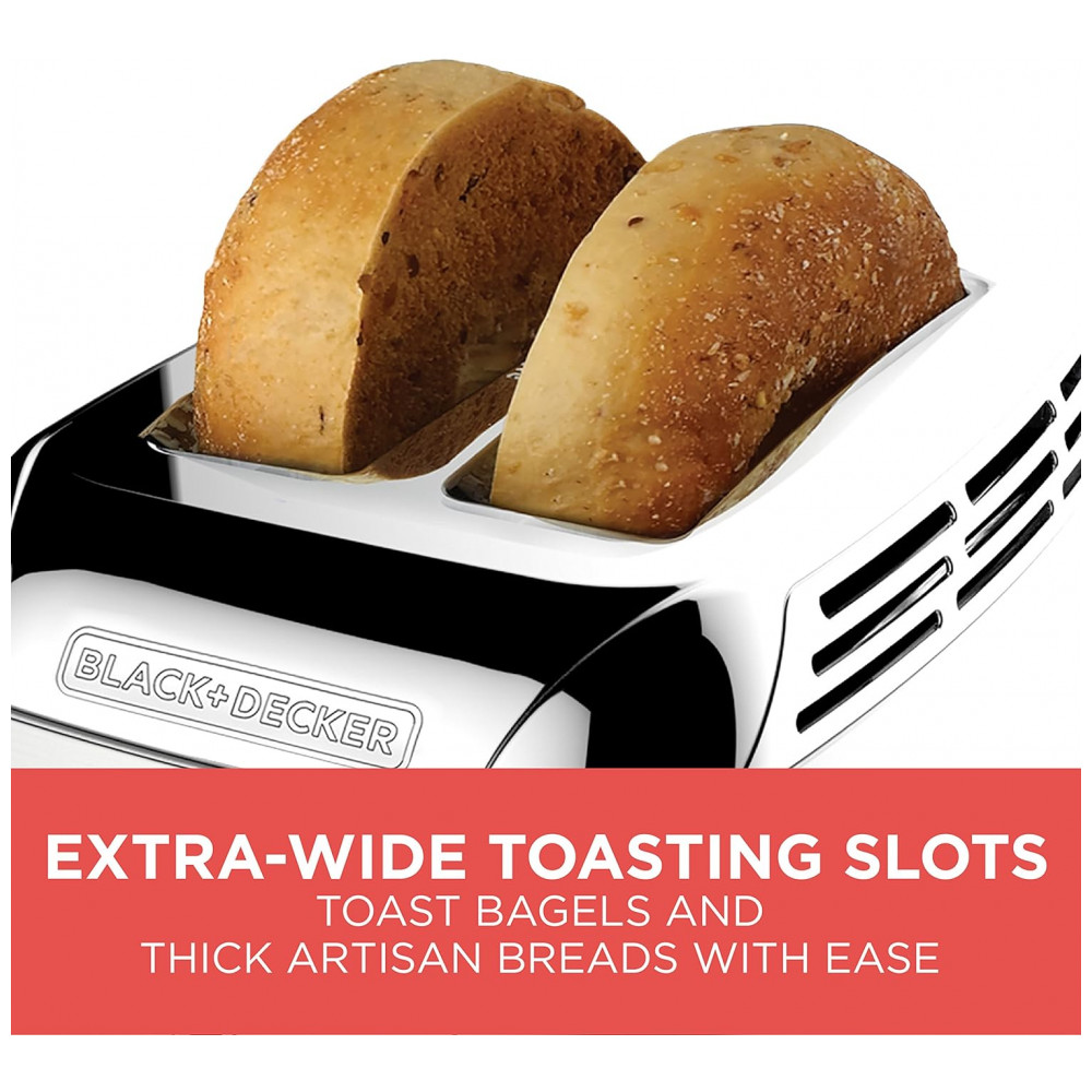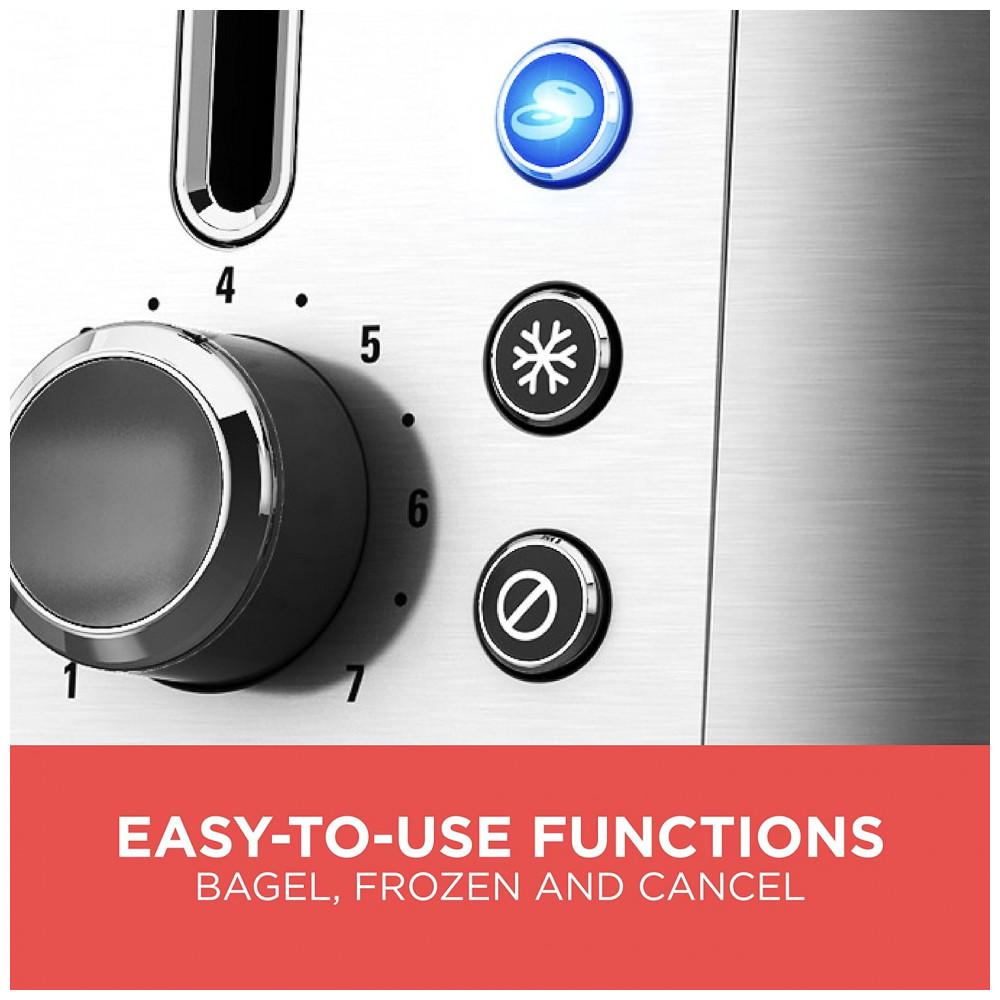 As ranhuras para torrar extragrandes permitem uma grande variedade de pães, com guias autocentrantes que se ajustam a qualquer espessura Padrão, Bagel e Frozen Botões de função iluminados simplificam trabalhos especiais de torrar, como bagels e waffles congelados Levantamento extra A alavanca estendida fornece levantamento extra, tornando mais fácil recuperar suas guloseimas quentinhas sem queimar os dedos