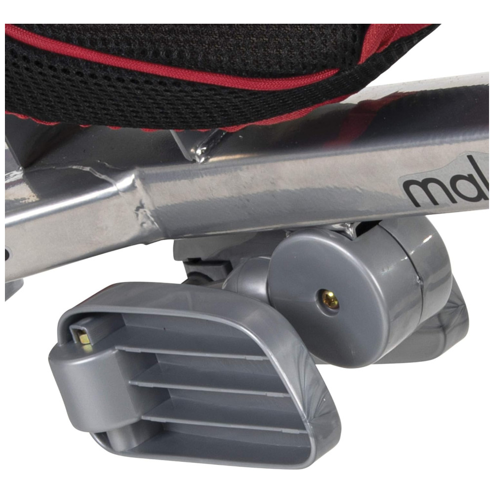 A estrutura prateada é acentuada pela capa de assento vermelha brilhante e o dossel prendem a criança no assento com o arnês acolchoado.