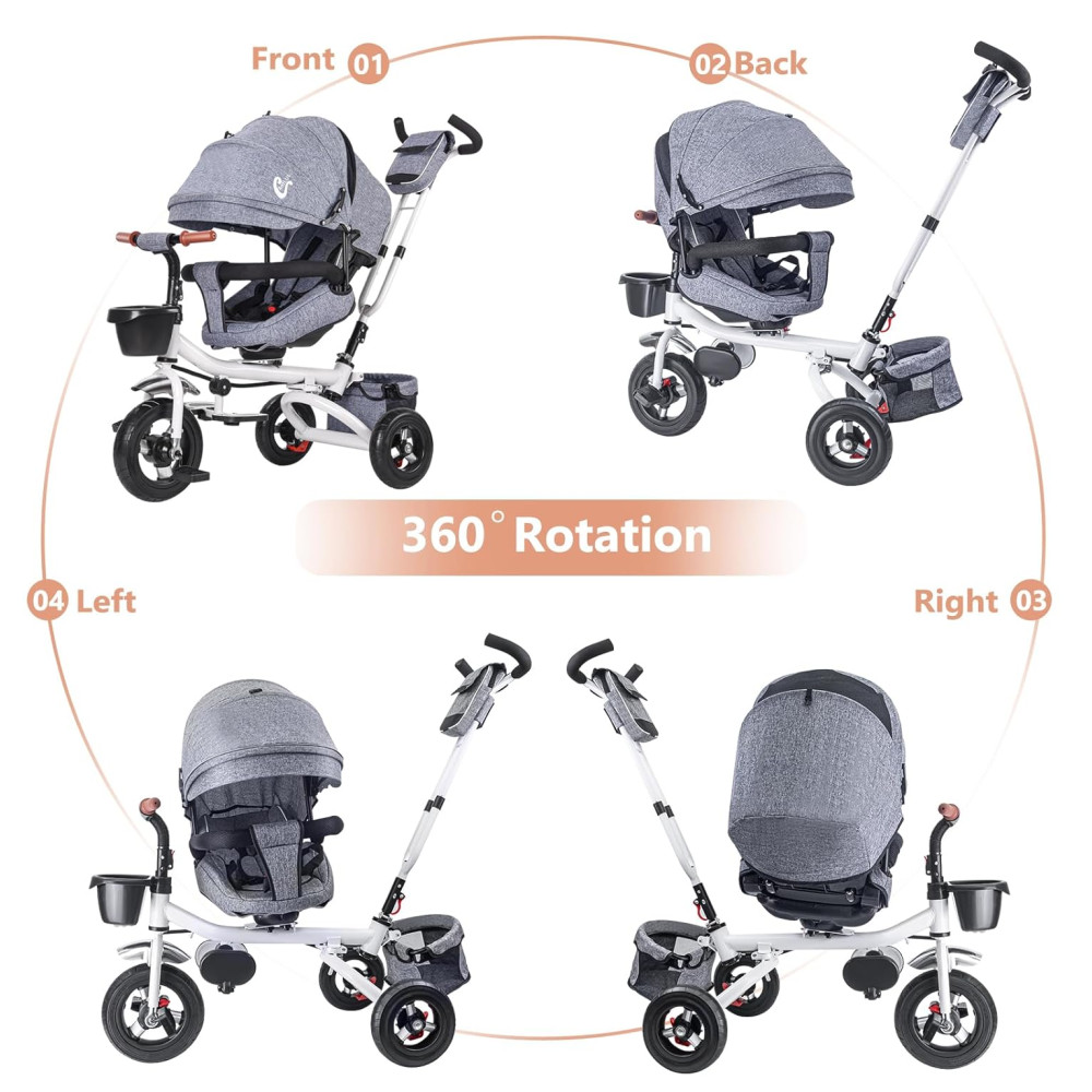 Com quatro modos de uso diferentes triciclo de empurrar, triciclo de direção, aprender a andar de triciclo e triciclo independente este produto atende às necessidades do seu bebê em diferentes estágios de desenvolvimento.