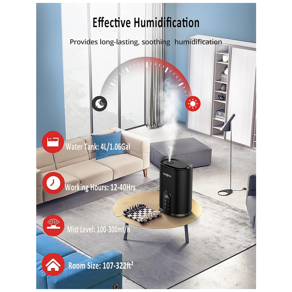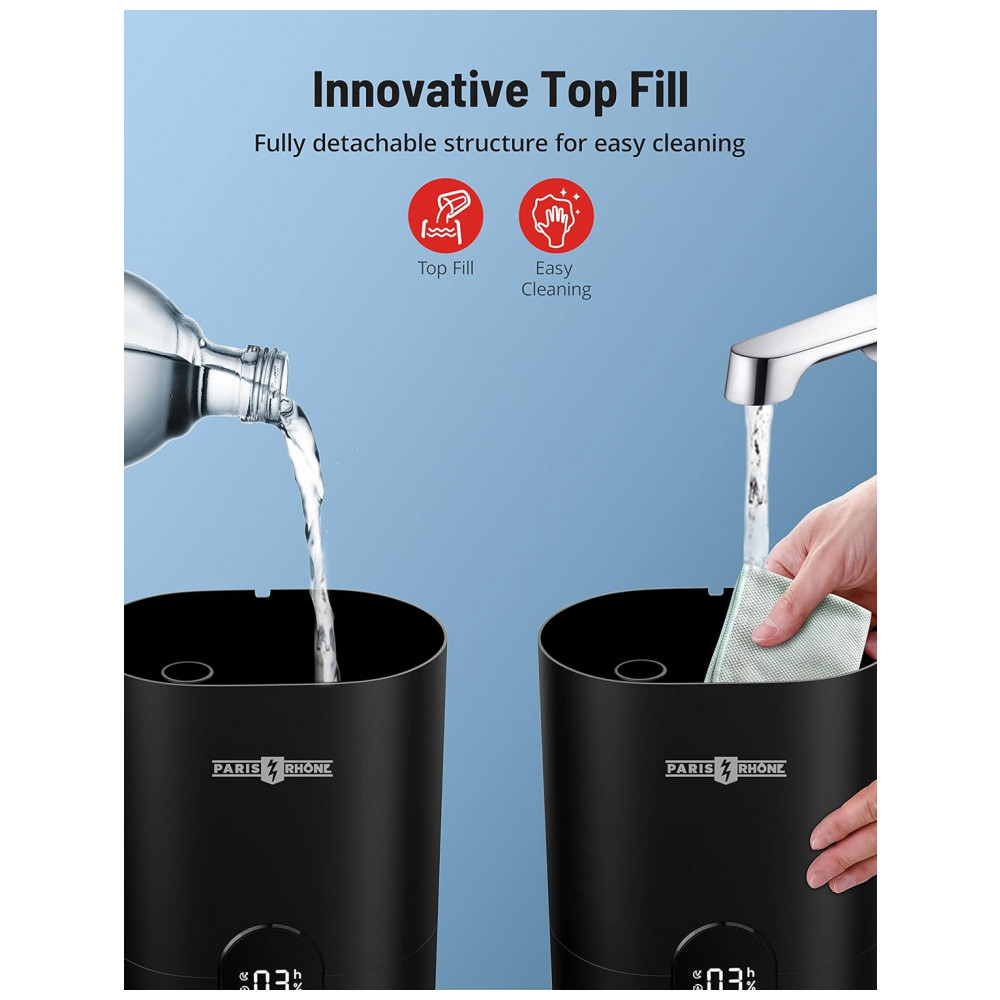 Umidificador Ultrassônico Portátil 4L com Aromaterapia, até 30H, Área 30m2, 110v, PARIS RHÔNE PE AH017, Preto: Durável e Os componentes internos totalmente nano revestidos aumentam a durabilidade do umidificador e várias proteções protegem o processo operacional para garantir uma longa vida útil.