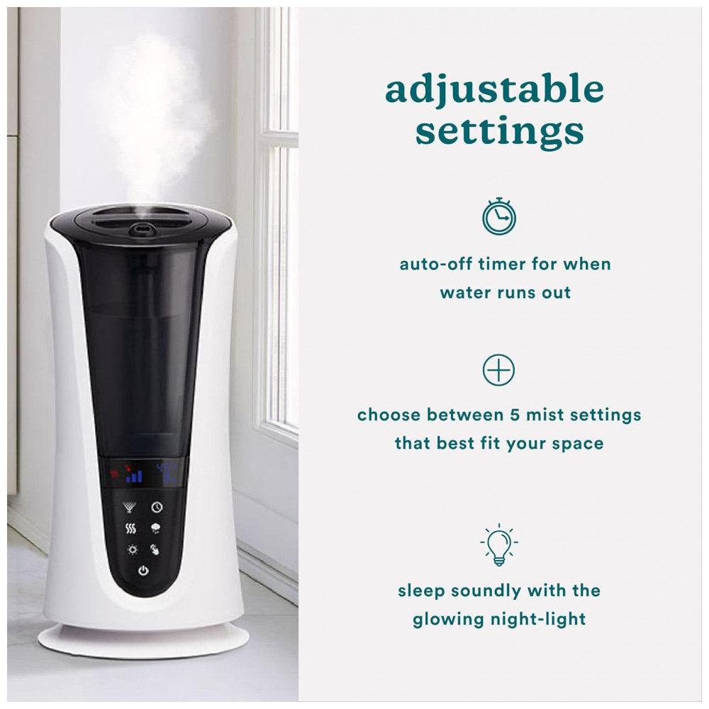 CONFIGURAÇÕES AJUSTÁVEIS Escolha entre 5 configurações de névoa que melhor se adaptam ao seu espaço enquanto utiliza a luz noturna embutida e o desligamento automático.