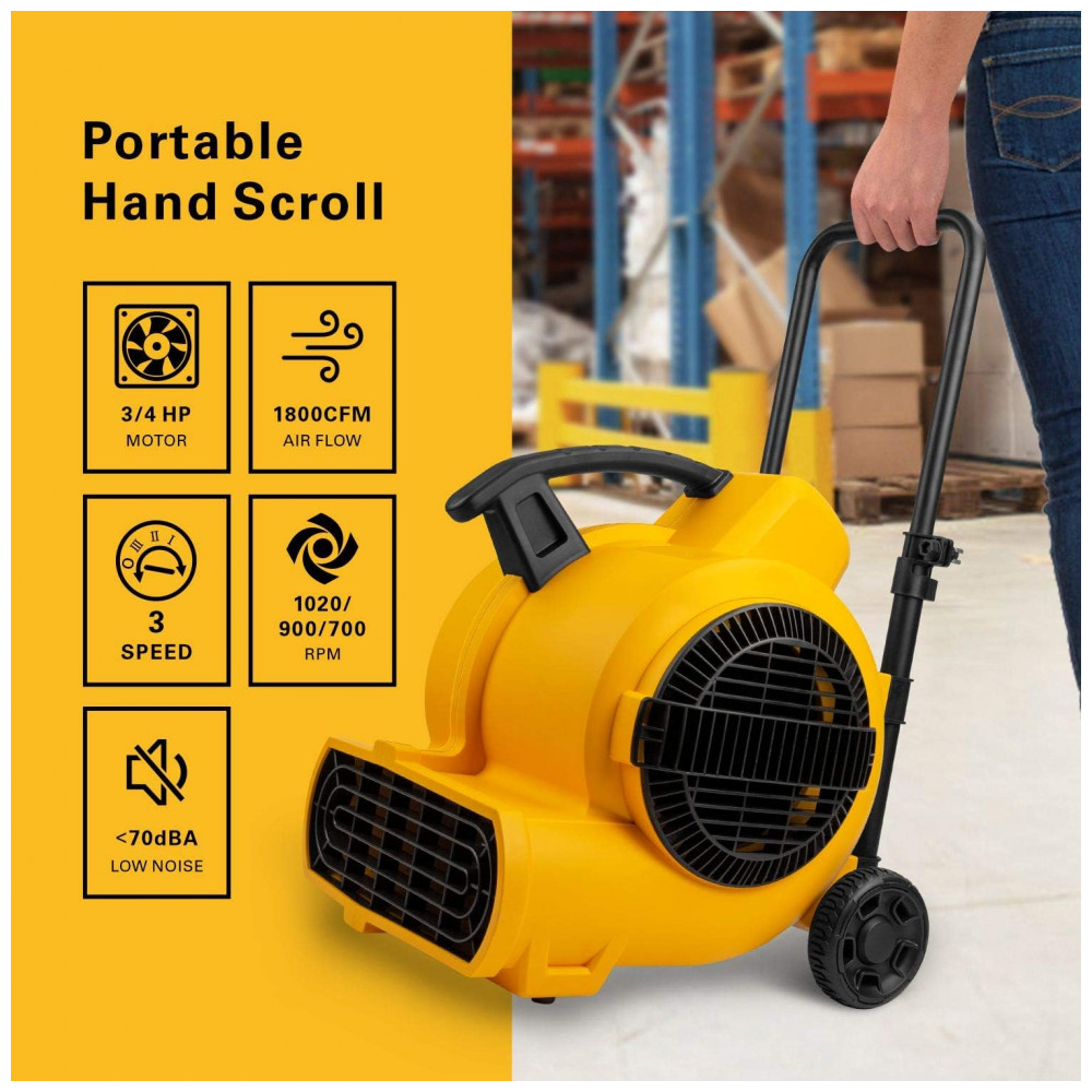 POTÊNCIA ULTRA FORTE Equipado com um motor de indução potente de 3 4 CV, este ventilador oferece um fluxo de ar de 1800 CFM, tornando o ideal para restauração de danos causados por água, remoção de mofo, secagem de carpetes e trabalhos de limpeza e saneamento.