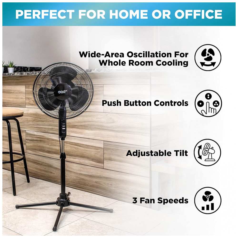 Conheça o Ventilador de Pedestal Oscilante Comfort Zone de 40,6 cm Fluxo de Ar Personalizável Desfrute de flexibilidade com três opções de velocidade neste ventilador oscilante de pedestal de 40,6 cm.