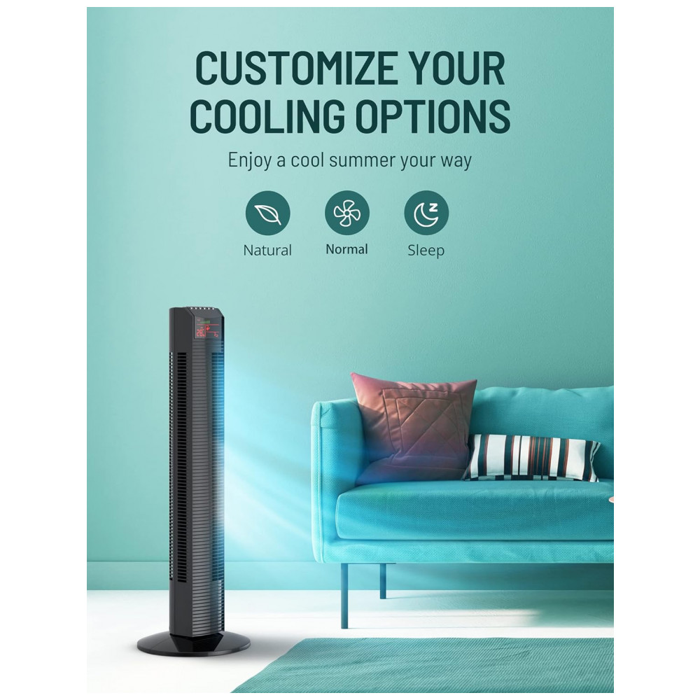 Ventilador de Torre Oscilante sem Lâminas com 3 Modos, Temporizador 12H, 110V 45W, Mirdred, Preto: Apresentando o Ventilador Torre Mirdred Ventilação Personalizada e Silenciosa para Seu Conforto Fluxo de Ar Personalizável O ventilador torre para o quarto permite ajustar a brisa conforme sua preferência, com 9 opções de resfriamento variáveis, incluindo 4 modos de brisa Normal, Natural, Sono, Automático e 3 velocidades Alta, Média, Baixa .