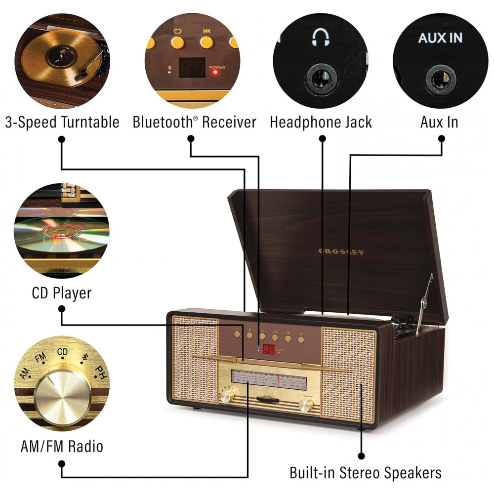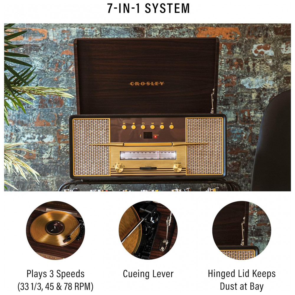 Vitrola, Toca Discos 3 Velocidades Bluetooth Rádio AM, FM CD, CROSLEY CR7016A MA, Marrom Escuro: Equipado com um toca discos de 3 velocidades, receptor bluetooth, rádio am , fm, cd player e entrada auxiliar o receptor bluetooth integrado permite que você transmita sua música sem fio para os alto falantes de alcance total A saída rca permite que você conecte facilmente a rapsódia a um sistema estéreo ou alto falantes existentes gabinete de madeira adiciona um toque elegante e possui uma tampa combinando com dobradiças de metal para ajudar a evitar a entrada de poeira entrada de fone de ouvido para audição privada