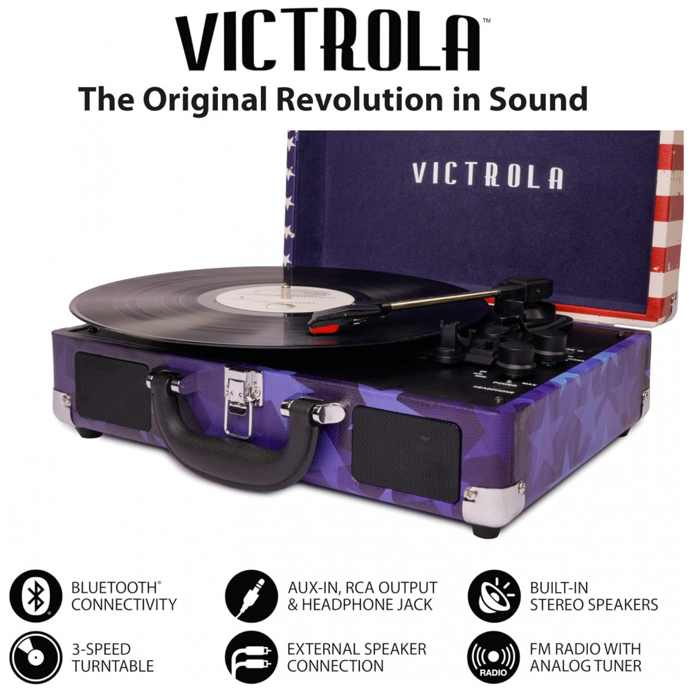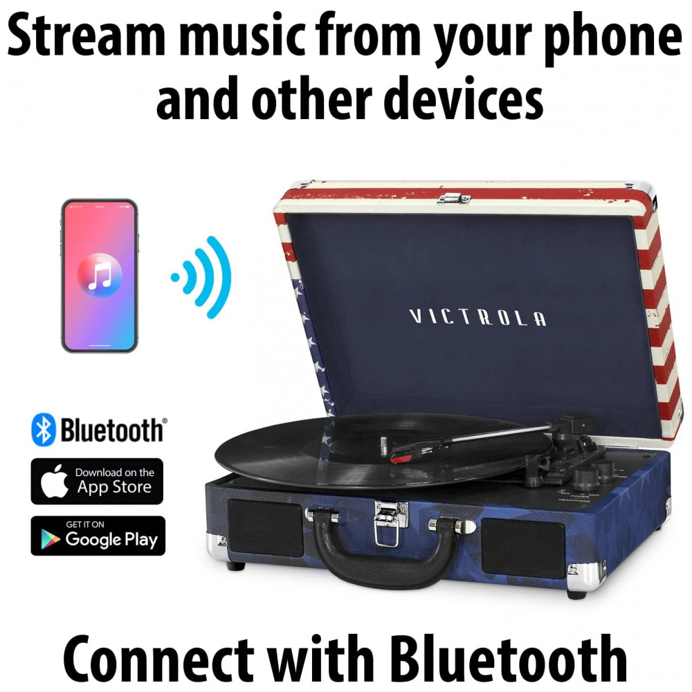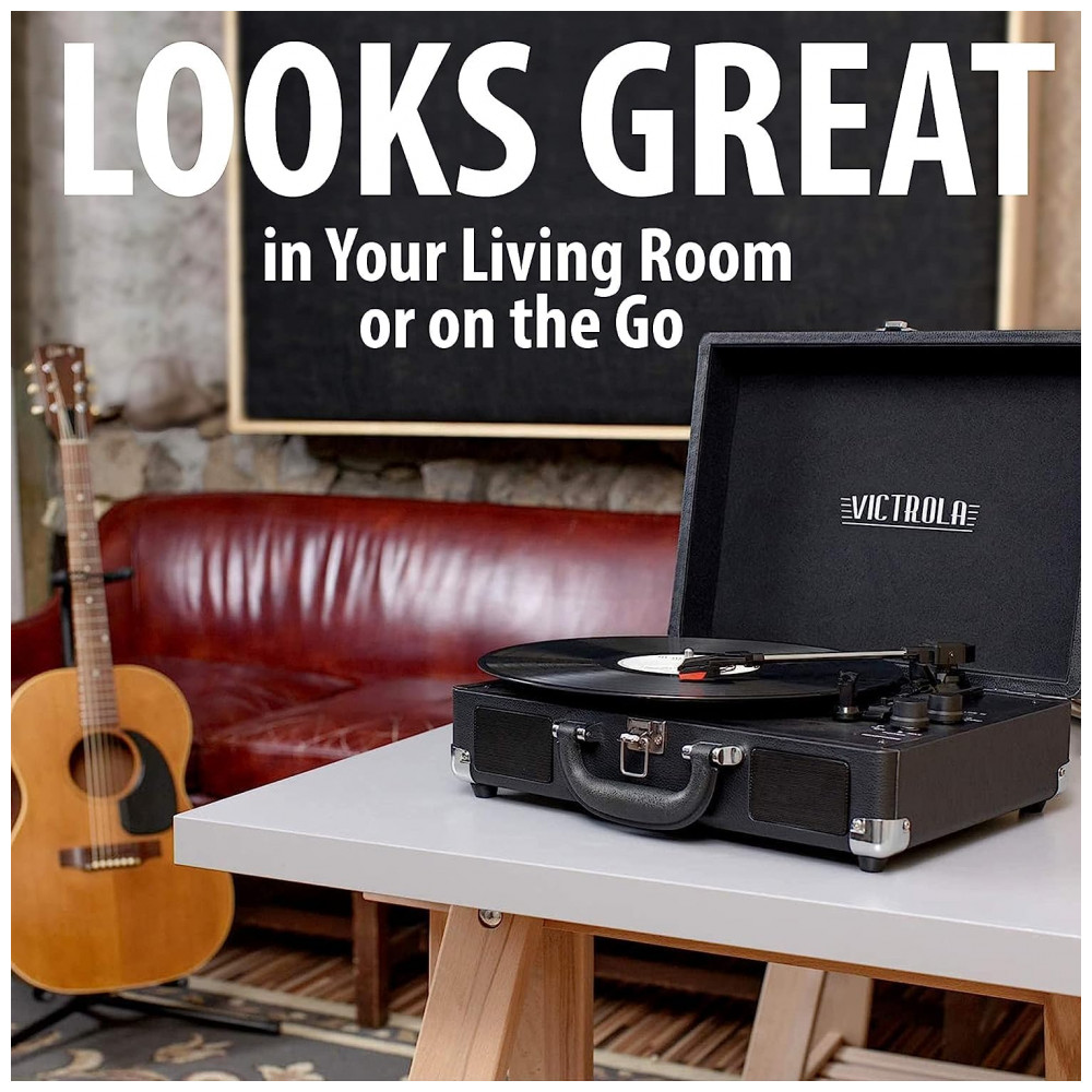 LEVE SUAS MÚSICAS PARA QUALQUER LUGAR Alojado em uma mala vintage com uma alça de transporte fácil, a mistura de design retrô e contemporâneo da Victrola oferece a máxima flexibilidade para ouvir música onde você quiser e como quiser uma ótima opção para os amantes de vinil OPÇÕES DE CONEXÃO EXPANDIDA Transmita o áudio do smartphone através dos alto falantes Bluetooth integrados do toca discos.