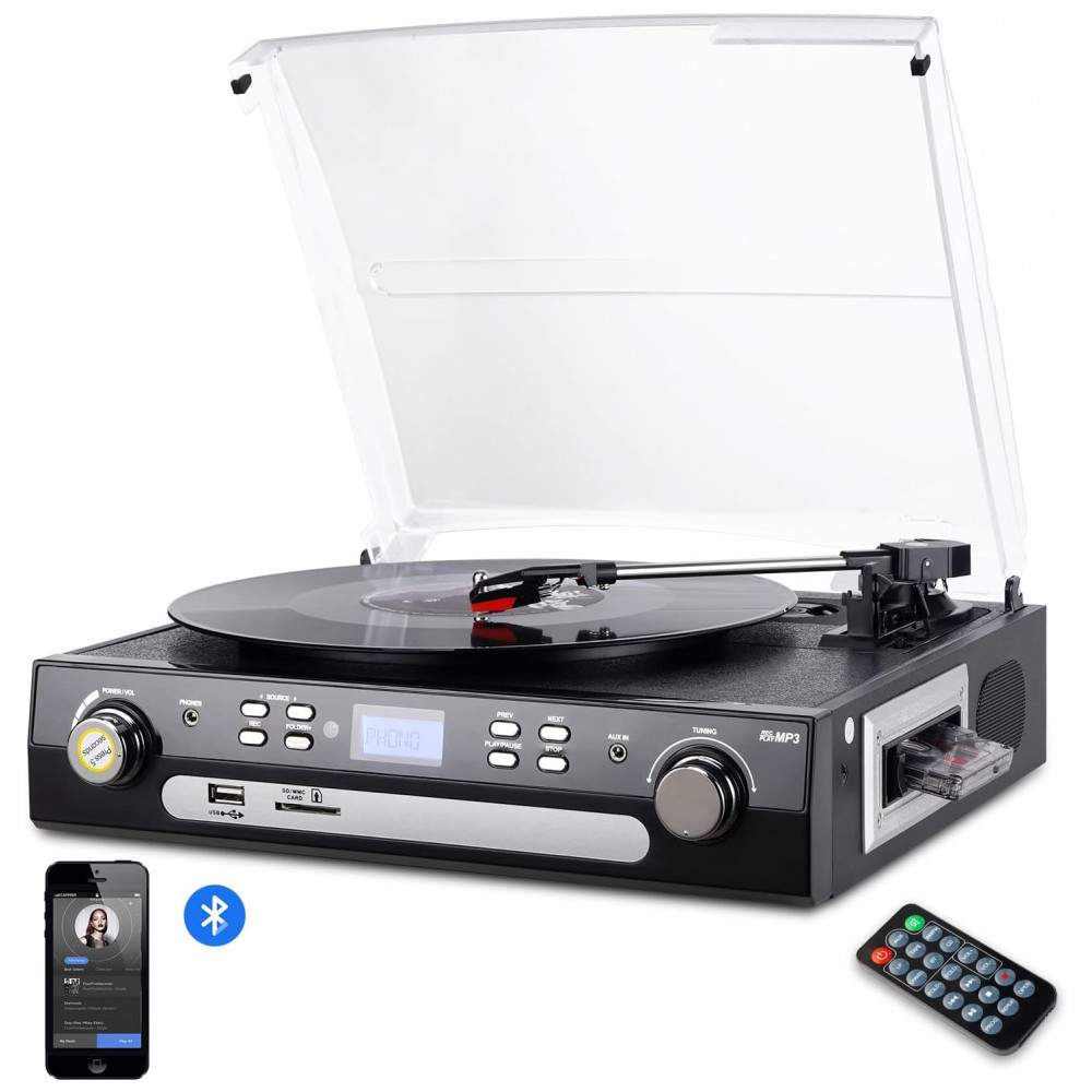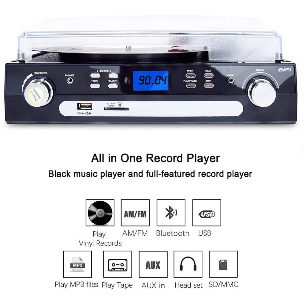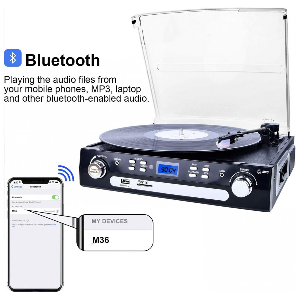 Reproduzindo música de um dispositivo externo sem fio, como telefone moblie, laptop e outro dispositivo bluetooth Codificação USB, SD Converte vinil em unidade flash USB, cartão SD diretamente no formato MP3.