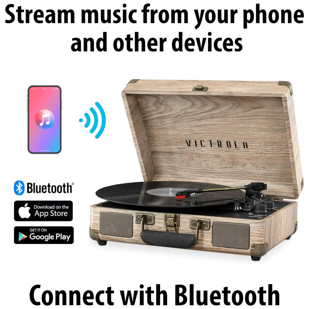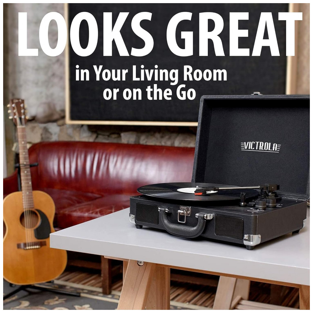 É perfeito para sua sala de estar, quarto ou escritório LEVE SUAS MÚSICAS PARA QUALQUER LUGAR Alojado em uma mala vintage com uma alça de transporte fácil, a mistura de design retrô e contemporâneo da Victrola oferece a máxima flexibilidade para ouvir música onde você quiser e como quiser uma ótima opção para os amantes de vinil OPÇÕES DE CONEXÃO EXPANDIDA Transmita o áudio do smartphone através dos alto falantes Bluetooth integrados do toca discos.