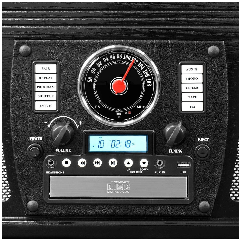 Vitrola Toca Discos Retrô Central Multimídia Alto falantes Estéreos Integrados, 110v, VICTROLA VTA 600B BLK, Preto: CENTRO DE ENTRETENIMENTO 8 em 1 Com aparência vintage e recursos modernos, este toca discos não apenas toca seus vinis, mas também possui um CD e toca fitas, rádio FM, Bluetooth e entrada Aux e fone de ouvido para streaming de áudio de seu smartphone NÃO É NECESSÁRIO SISTEMA ESTÉREO OU EQUIPAMENTO EXTRA.