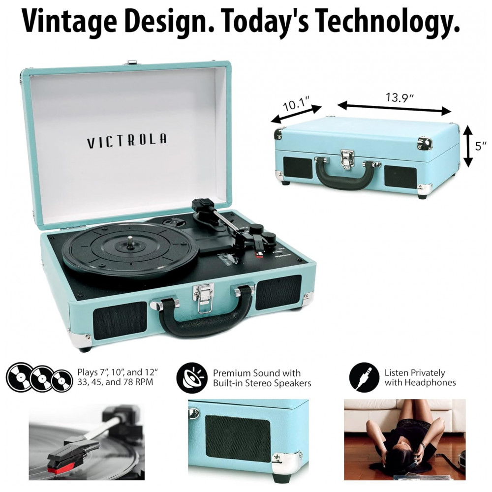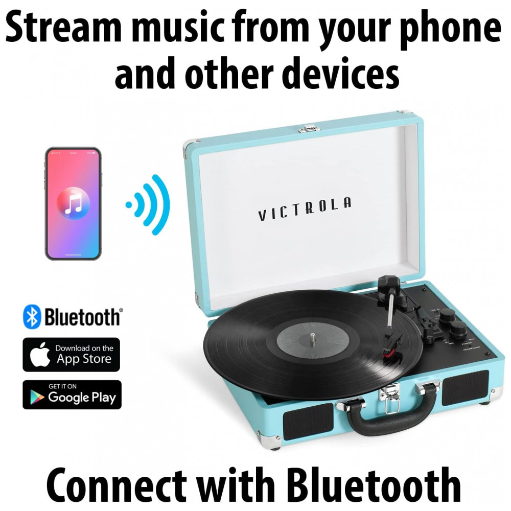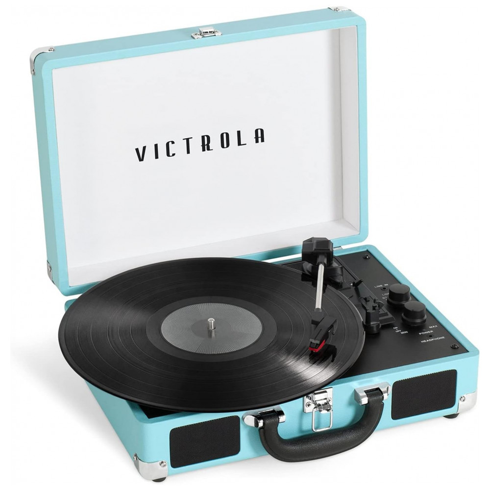 Vitrola Toca Discos Retrô Vitrola, 3 Velocidades com Bluetooth, 110v, VICTROLA VSC 400SB TRQ SDF, Azul: TOCA DISCO DE TRÊS VELOCIDADES ACIONADA POR CORREIA Este toca discos de mala de 3 velocidades 33 1, 3, 45, 78 rpm apresenta QUALIDADE DE SOM PREMIUM ATUALIZADA e fica em pés de isolamento de som que evitam vibração.