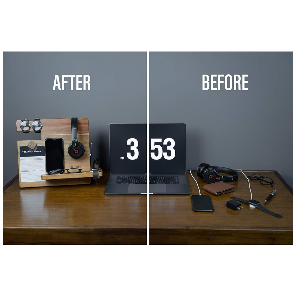 DESIGN MODERNO E VERSÁTIL Para ajudar nossos clientes a acompanhar seu estilo de vida moderno, nossa elegante estação de encaixe de madeira tem um recorte para carregador de relógio inteligente, fone de ouvido, relógios, etc.